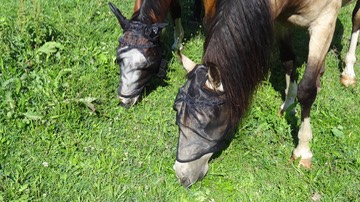 Wow, it was 70 at 8AM. It's raining off and on, so as you can see we were sent out without our fly masks (although we did get a good soak with some nice citronella-scented spray). We hope the flies keep their distance, because we always enjoy going out without the masks: It makes it easier for us to give each other dirty looks!