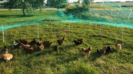Mary and Mara put a green net over the chickens’ new yard: