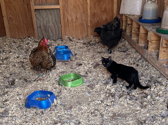 It’s Eva! She’s getting tamer every day and the chickens love her. When she becomes a little bigger, the cat-cops should have no trouble taking her to the vet: