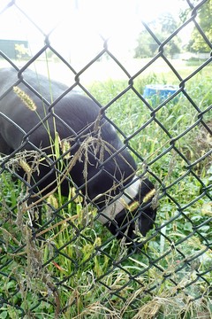 Dukie is sniffing around the backyard: