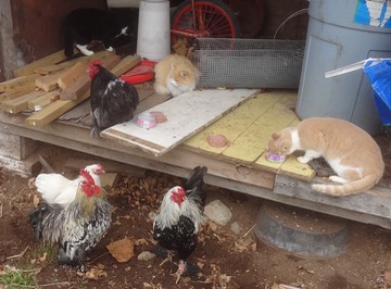 This morning was super windy. The trash cans and the port-a-potty blew over. We had to chase our breakfast hay all over the pasture. The only people with a secure place to eat were the cats and chickens: