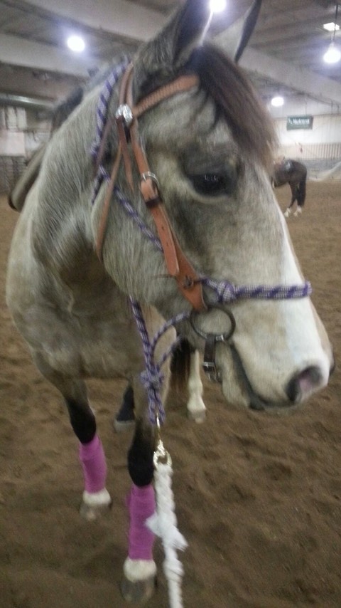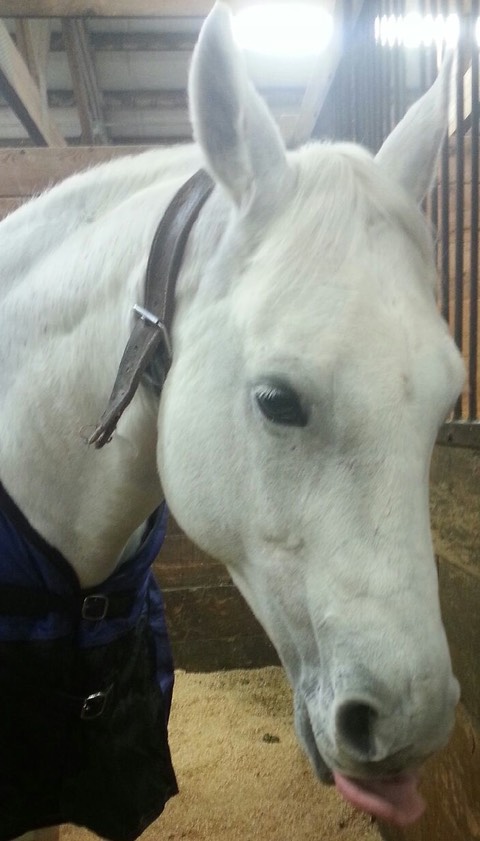 Here we see Elwood, cribbing collar in place, defending his stall-neighbor and main squeeze: