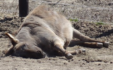 Pick your Caption: (1) Horse plays possum. (2) Francis proves that cows aren't the only thing you can tip*. (3) Chavez shows us that horses don't have to sleep standing up, especially when there's room to lay down and a warm March sun in which to bask.